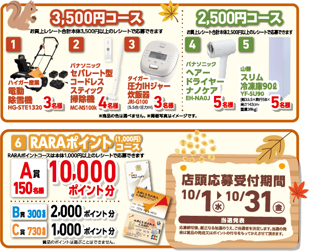 実施期間中にお買上げ頂いた、参加メーカー商品を含むラルズ各店の応募コースごとの対象金額以上のレシート